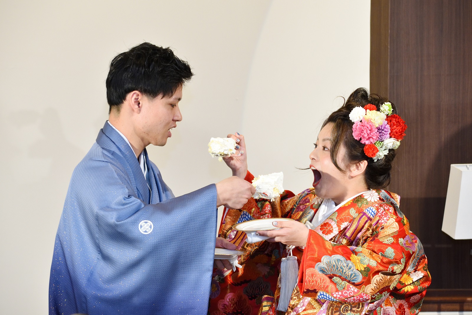ケーキ入刀の後はケーキの食べさせあいっこ。