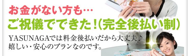 ぜひYASUNAGAで相談をしていただきたい。お金も安くてスタッフさんの評判も良く親切で満足できる結婚式を挙げる事ができます!!