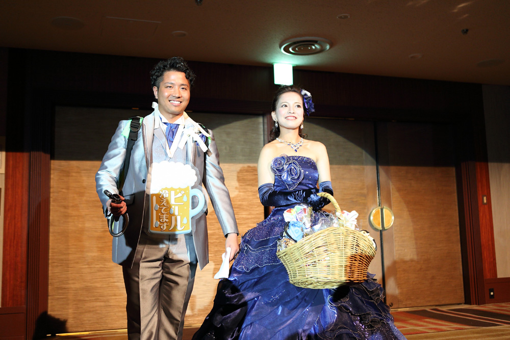 新郎が「ビール冷えてますよ」という文字の入ったプレートを首からぶら下げて歩き、その隣で私がおつまみを配って歩きました。