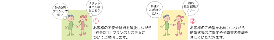 カップル1組に1人の専属ウエディングプランナーが、結婚式の費用の事から結婚式当日まで責任を持っておふたりを全力でサポートさせていただきます。ですので毎月お受できるカップル数に限りがございますので定員が埋まる前にお早目にご来店ください。そして、今日にでも、定員が埋まる可能性があるということだけはご了承ください。